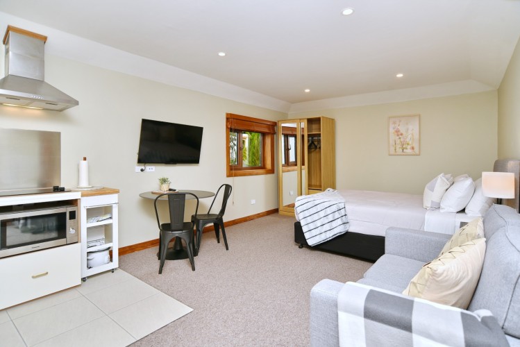 This stylish studio is thoughtfully designed for both short and extended stays. The open-plan layout includes a cosy lounge space, a compact kitchenette for simple meals, and a comfortable queen-sized bed for a restful night’s sleep.